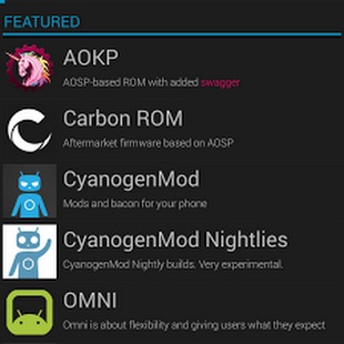 With ROM installer you can always be up-to-date with your favorite ROM and recovery. Popular ROMs available for install include CyanogenMod (cyngn), Android Open Kang Project (AOKP), Paranoid Android, OMNI, Carbon, Slim, Vanir, PAC-man and others. In order for a particular ROM to be visible your device must be supported by the ROM.